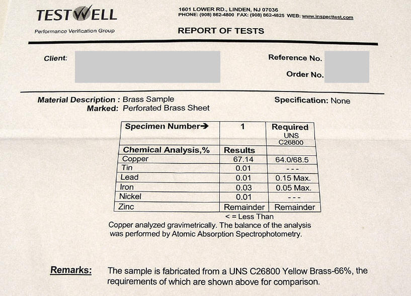 Common brass sheet today is made from the alloy C26000, known as "cartridge brass." It is 70% copper and 30% zinc, with a few other allowable trace elements. Every replica today has this standard alloy in its antenna. But is that the right stuff as found on authentic comms? We commissioned a chemical assay that vaporized a tiny bit of our sample, and the answer is a surprising "not quite."
