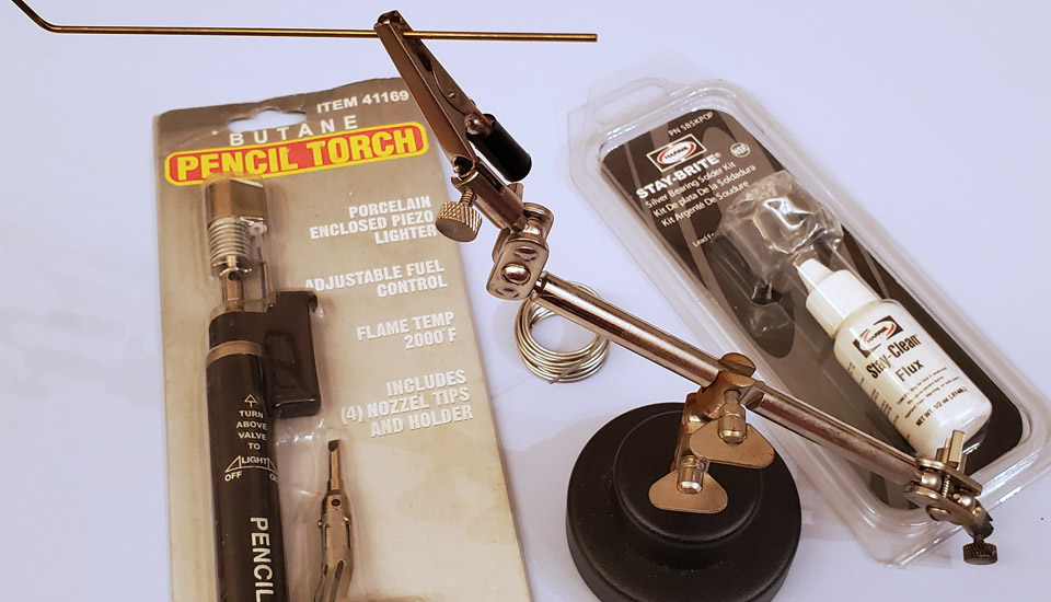 8. Firmly secure prior to soldering the brass wire to your formed antenna using the thin, strong steel wire found in your average grocery store twisty-tie. Just peel the paper away and the stuff is perfect for holding tight (twisted with pliers) the parts together. 9. Solder using a butane pencil torch. Don't be intimidated by this; if you're crafty enough to have done the others steps above, you'll find flame soldering easy enough.